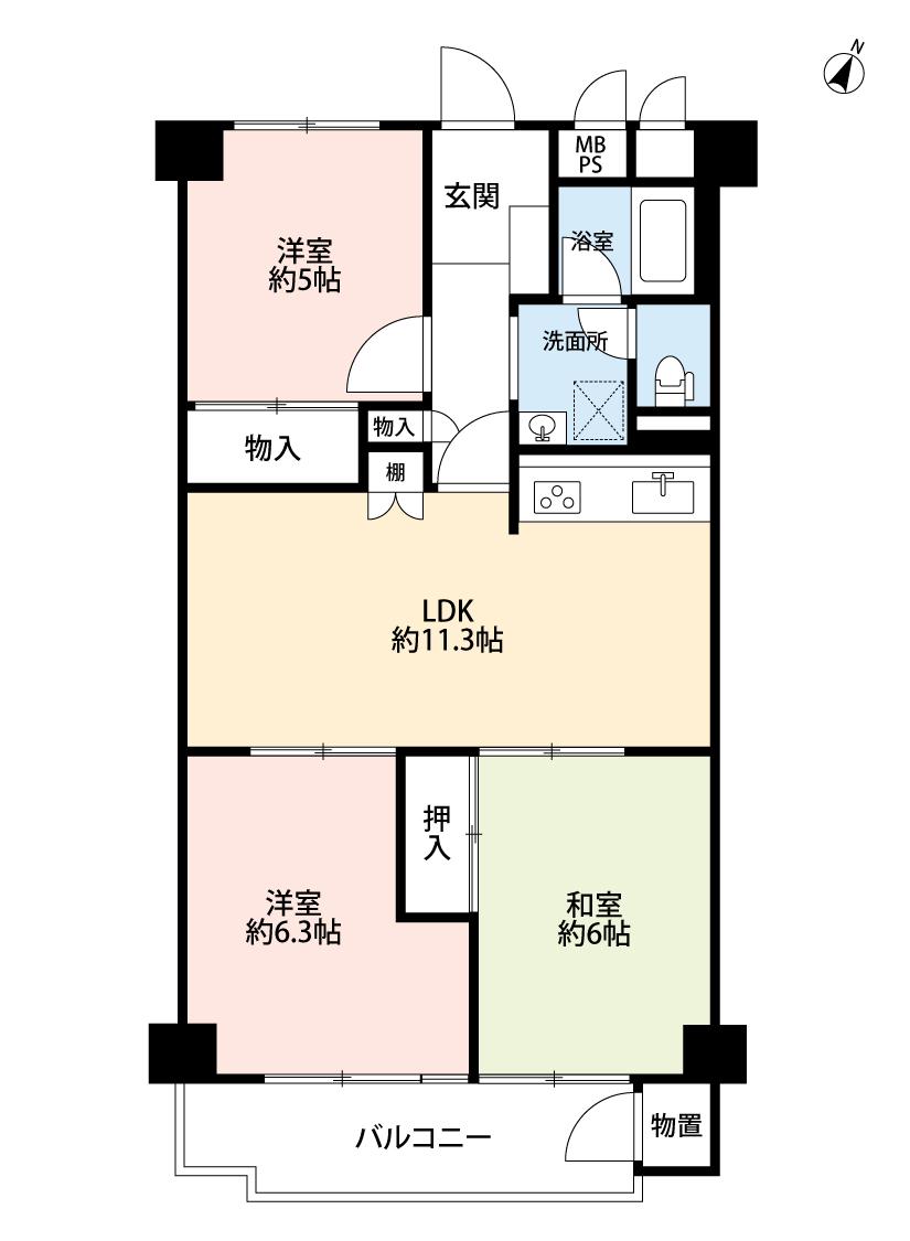 | 間取り | 3LDK | 間取り内訳 | LDK11.3畳 和6畳 洋6.3畳 洋5畳 |