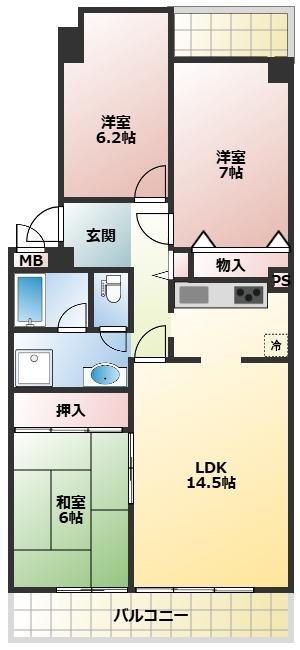 | 間取り | 3LDK | 間取り内訳 | LDK14.5畳 和6畳 洋7畳 洋6.2畳 |