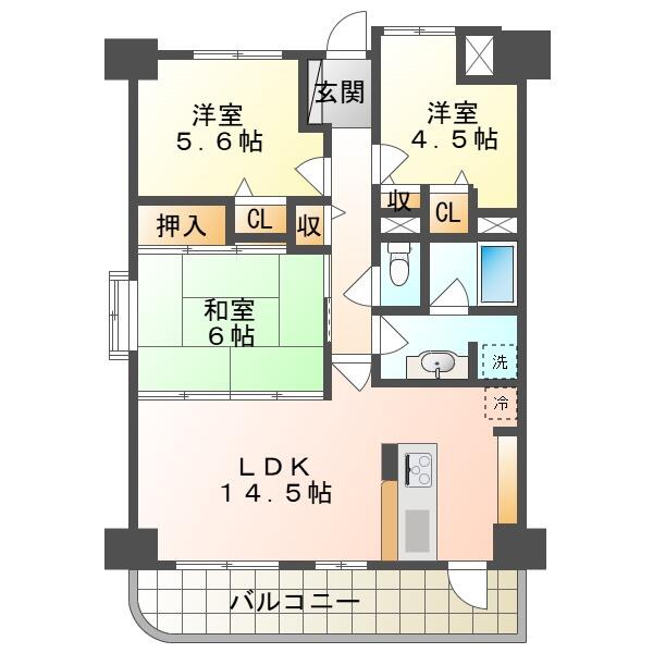 間取り | 3LDK | 間取り内訳 | 和6畳×1室 洋5.6畳×1室 洋4.5畳×1室 LDK14.5畳×1室 |