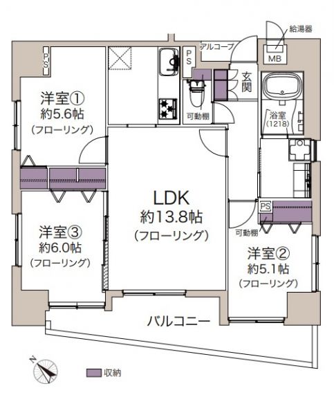| 間取り | 3LDK | 間取り内訳 | 5.6畳×1室 5.1畳×1室 6畳×1室 13.8畳 |