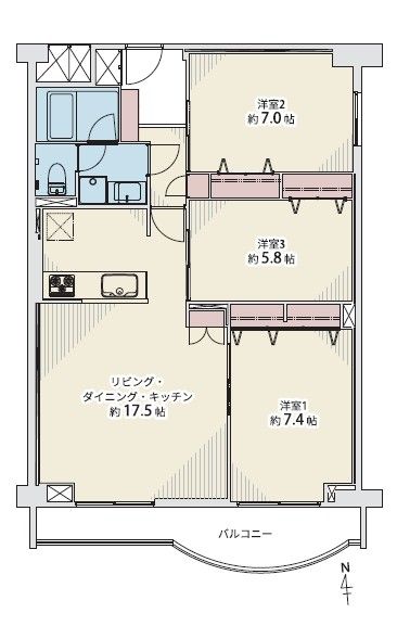 | 間取り | 3LDK | 間取り内訳 | LDK17.5畳×1室 洋7.4畳×1室 洋7畳×1室 洋5.8畳×1室 |