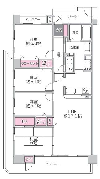 | 間取り | 4LDK | 間取り内訳 | 1FLDK17.1畳×1室 1F洋6.8畳×1室 1F洋5.1畳×1室 1F洋5.1畳×1室 1F和6畳×1室 |