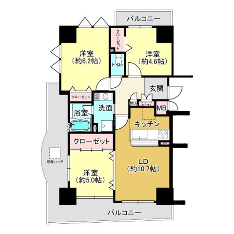 | 間取り | 3LDK | 間取り内訳 | LDK10.7畳 洋6.2畳 洋4.6畳 洋5畳 |